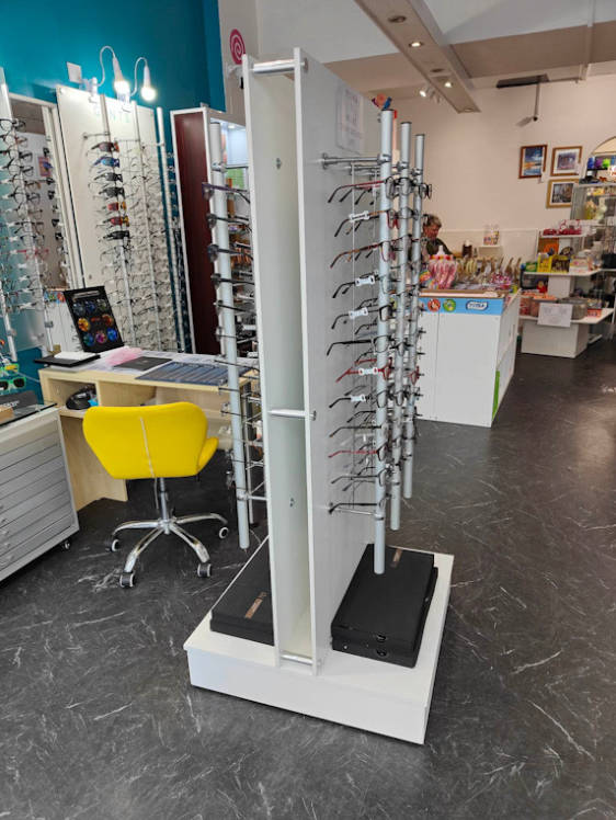 Bespoke item made for me from 2 wall panels( on wheels so mobile) Holds 72 frames. It is all white the black frame display cases are not included