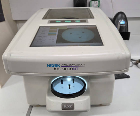 NIDEK Intelligent blocker, ICE-9000 blocks the lens with a lens cup. The lens is blocked with a lens