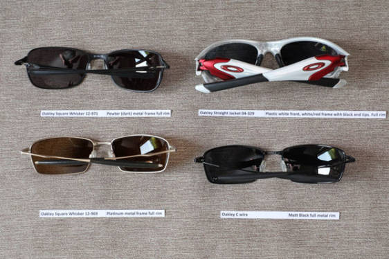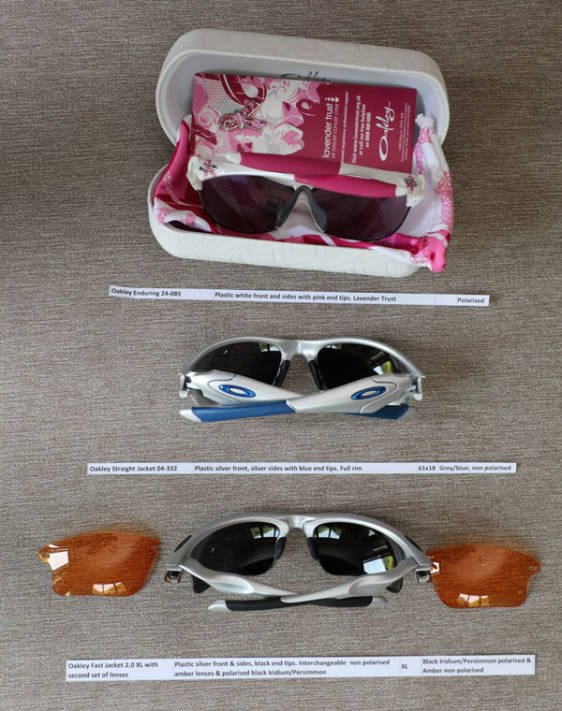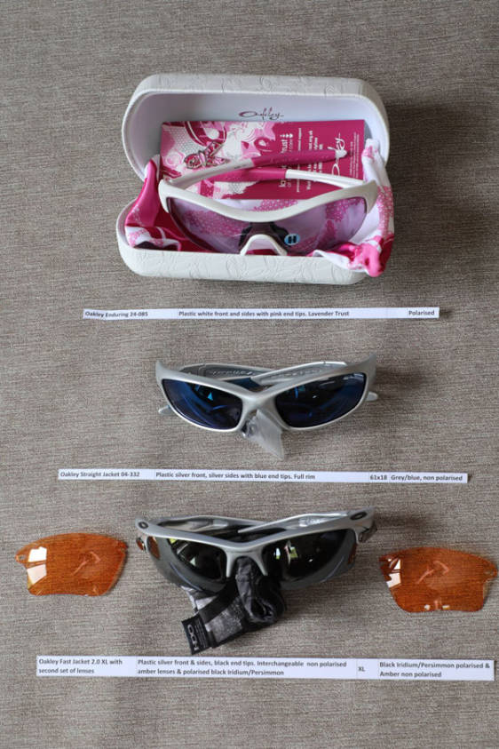 Sunglasses: All Oakley. Straight Jacket 04-329 & 04-332, Square Whisker 12-971 & 12-969, Fast Jacket 2.0XL with second set of lenses, C wire, Enduring 24-085 Lavender Trust. All include original cases and/or pouches.