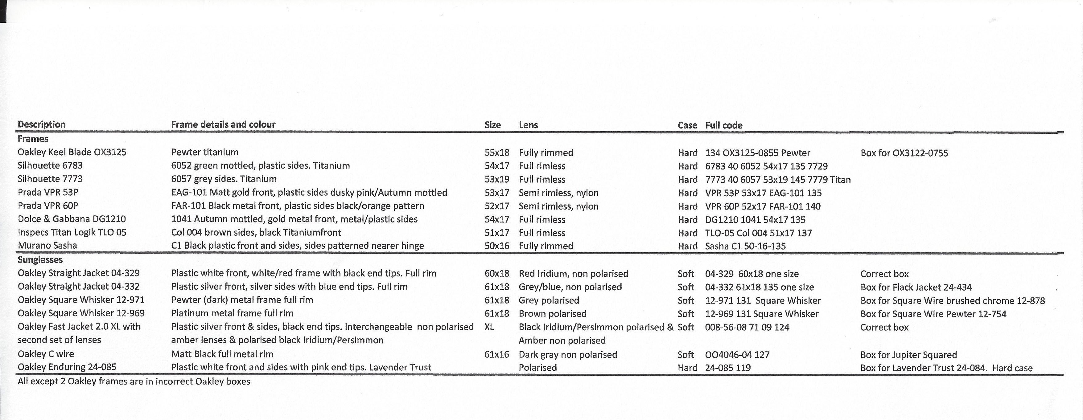 Frames: Silhouette 6783 & 7773, Prada VPR 53P & 60P. D&G DG1210, Inspecs Titan Logik TLO 05, Murano Sasha, Oakley Keel Blade OX3125. All include original hard cases.