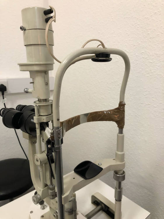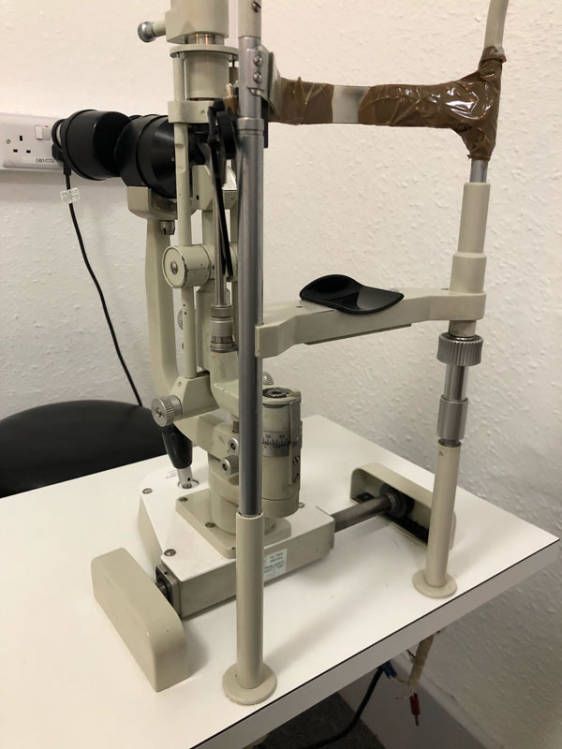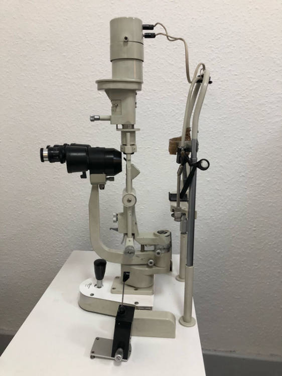 Shin Nippon Haag Streit style slit lamp with adjustable beam and slit height / rotation. Halogen illumination. Comes complete with table and Goldmann tonometer and probes.
